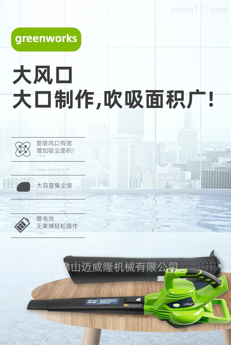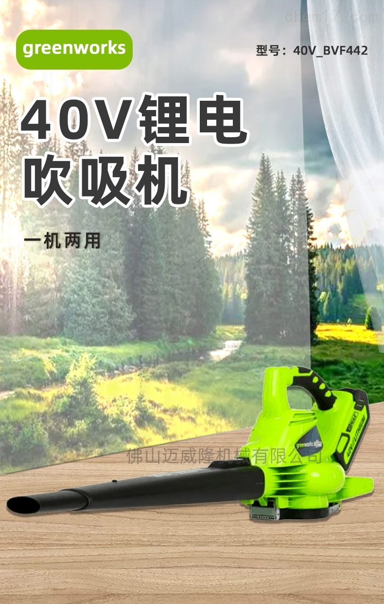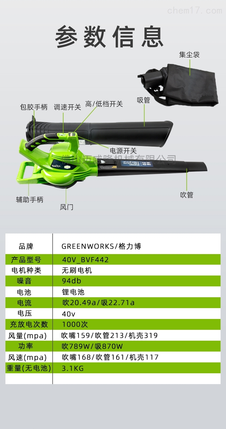 Glebe 40V bvf442便携式锂电池吹吸机产品参数:品牌:greenworks/Glebe产品型号:40V_bvf442电机类型:无刷电机噪音:94db电池:锂电池电流:吹20.49a/吸收22.71a电压:40V充放电次数:1000倍重量(无电池):3.1kg功率:吹789w/吸收870w风速(MPA):吹喷嘴168/吹管161/壳体177风量(MPA):吹管159/吹管213/壳体319