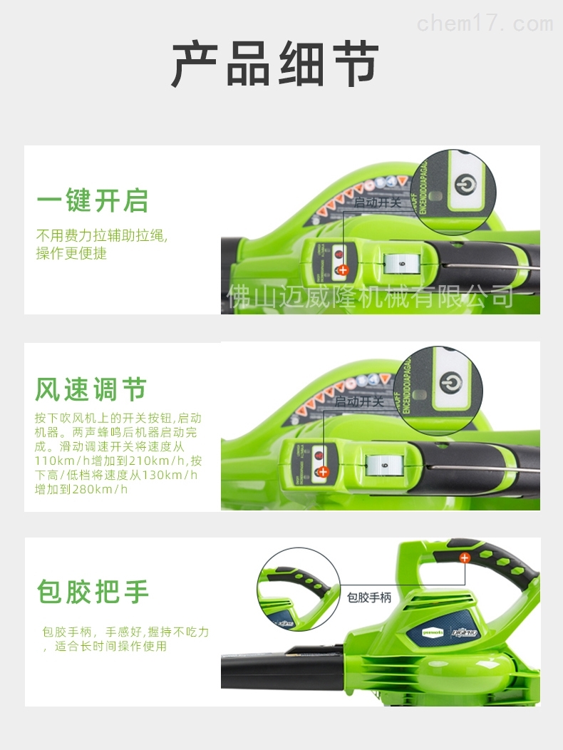 产品特点:glebe 40V锂电池抽风机,两用,一键启动,无刷电机,寿命长,锂电池,大功率。它有一年保修,灵活轻便。一台机器可以用于多种目的。它可以用于吹扫和抽吸。本实用新型吸力强,噪音低,省时省力。吹吸两用,操作方便,无需加油,方便快捷,风速调节,风速可多档调节;吹吸模式,吹吸双模式切换。连接集尘袋,便于清洁。风嘴具有较宽的吹吸面积,较宽的吸出口有效地增加了吸尘面积。