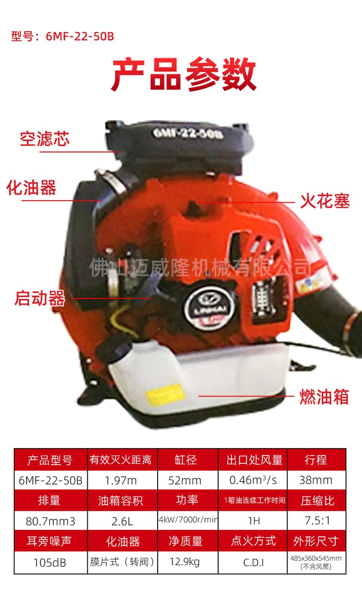 临海临海6mf-22-50b背负式风力灭火器森林消防救援风机二冲程除雪器产品参数:产品型号:6mf-22-50b有效灭火距离:1.97M气缸直径:52mm出口风量:0.46m3/s冲程:38mm排量:80.7mm3油箱容积:2.6L功率:4kw转速:7000r/min油箱油连续工作时间:1H压缩比:7.5:1耳侧噪声:105dB化油器:隔膜式(旋转阀)净质量:12.9kg点火方式:C.D.I外形尺寸:485x360x545mm(不含风道)